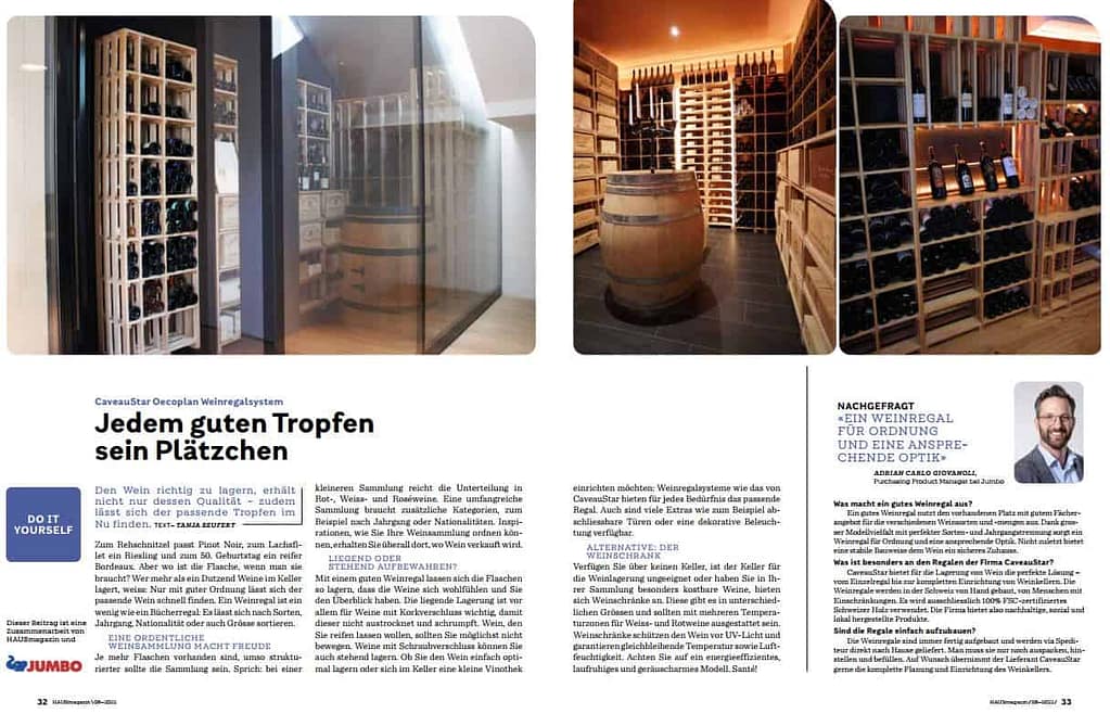 Wer Weine sammelt, kennt das Problem: Irgendwann verliert man den Überblick. Abhilfe (und vor allem Ordnung) schafft ein schönes Weinregal, in dem sich die guten Tropfen artgerecht lagern lassen. Für Jumbo schreiben wir regelmässig Sponsored Content in Form von redaktionellen Beiträgen, die im HAUSmagazin publiziert werden.